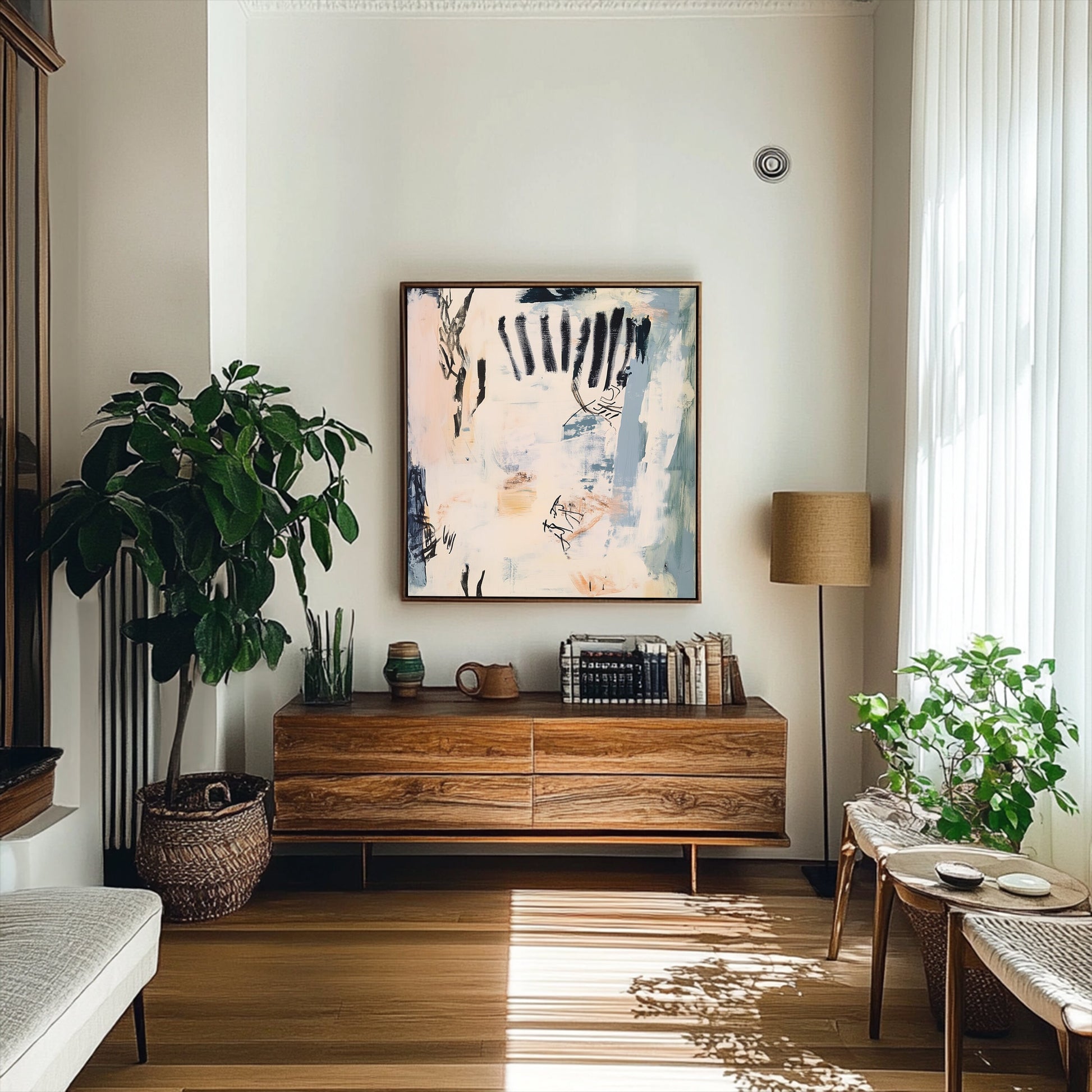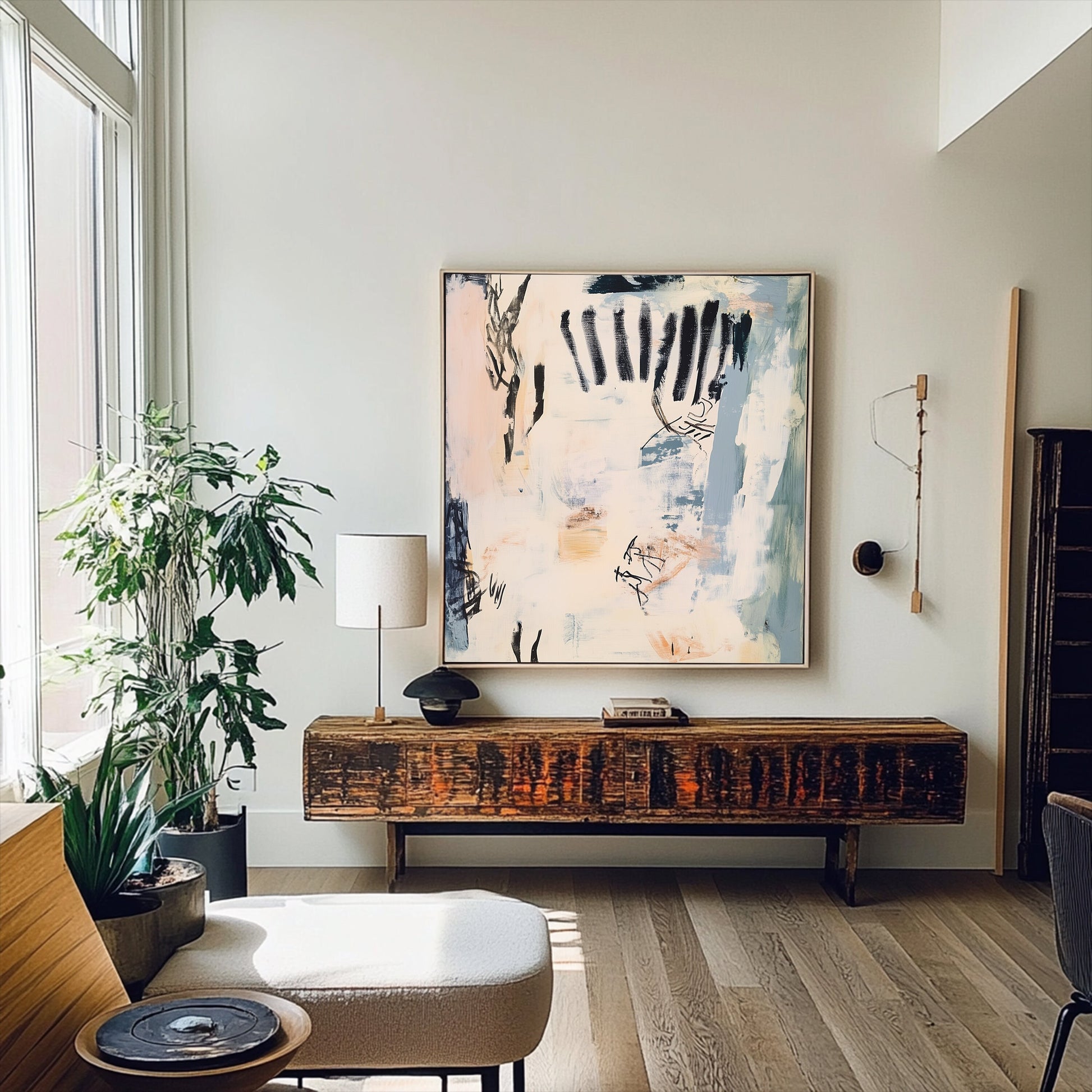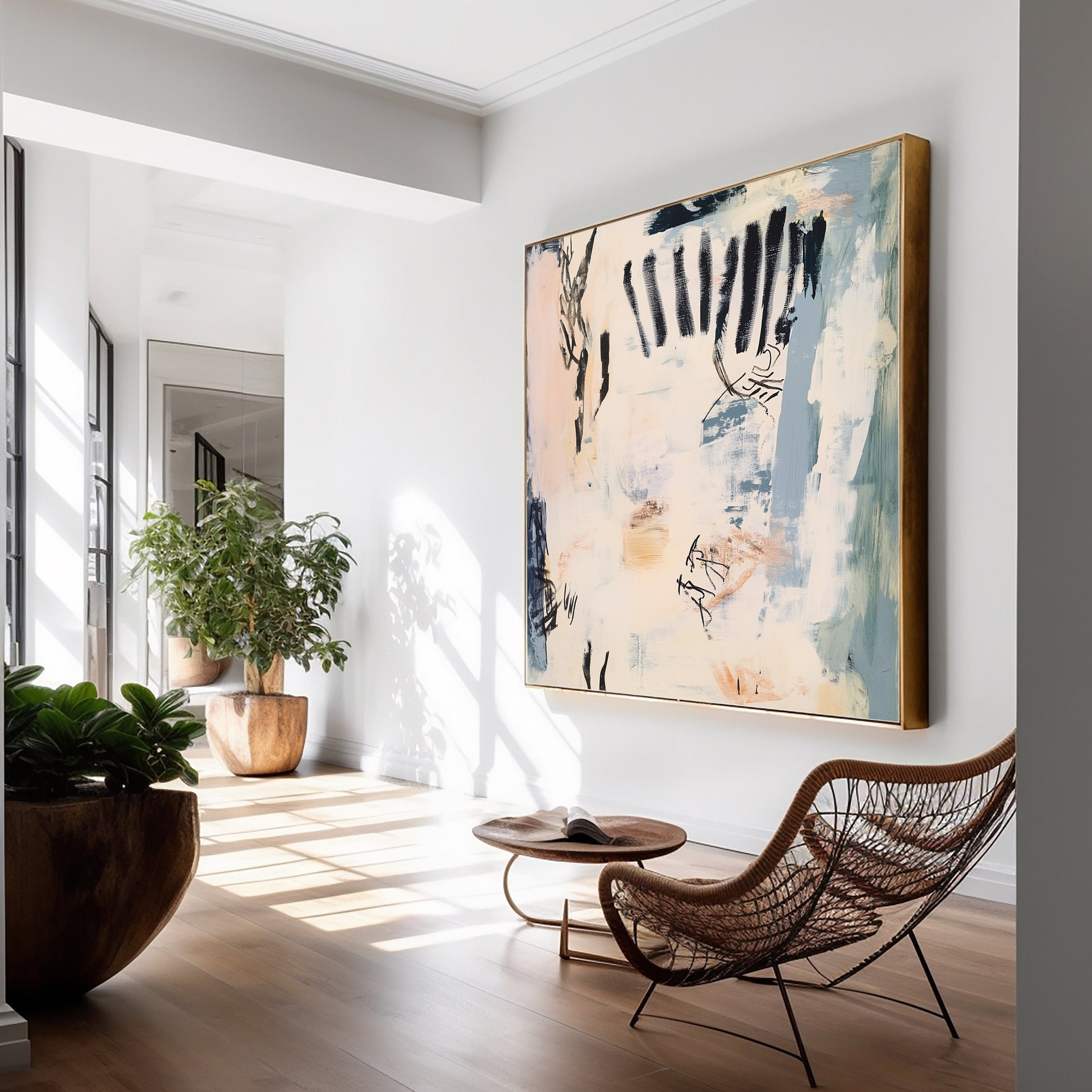 Boldly transform your living space with this striking large-format abstract print. The audacious interplay of beige and blue creates a visual rebellion against the ordinary, commanding attention while maintaining sophisticated appeal. This original artwork doesn't just decorate a wall—it makes an unapologetic statement about your fearless approach to design. Perfect for the living room that refuses to whisper when it can roar.
